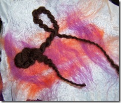 (yes, I know, very ugly, but we’re going for technique here, not design). I tried felting on plain habotai silk, which gives it a really cool rouched or gathered look; then I threw on wool roving and yarn to see if it would stick. Next, I took a piece of acrylic (craft) felt and started felting wool and silk roving onto it, then added more yarn and more roving: